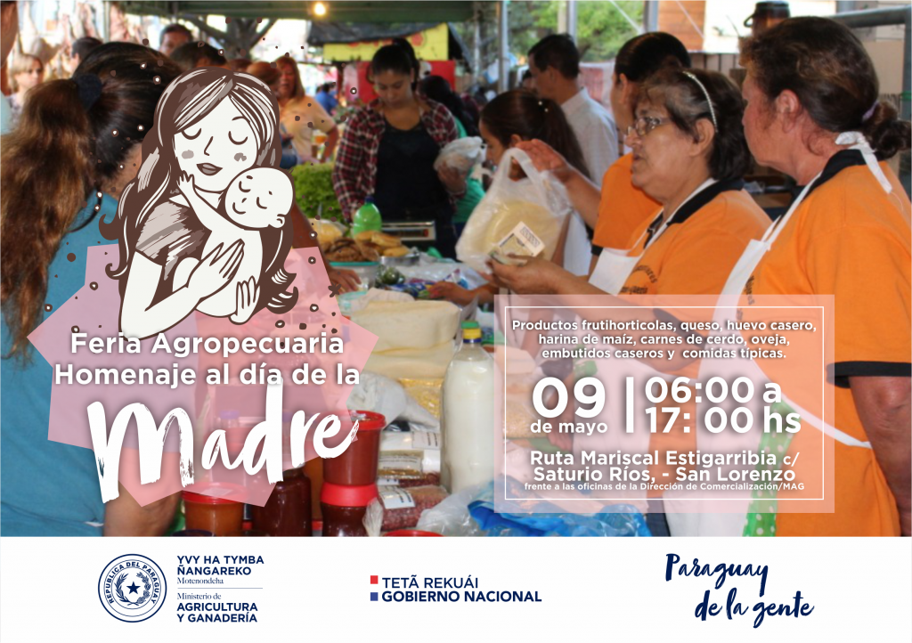 En el marco de los festejos por el día de la madre, el Ministerio de Agricultura y Ganadería (MAG), organiza una gran feria agropecuaria, que se lleva a cabo el día de hoy jueves 9 de mayo de 6:00 a 17:00 hs, frente a las oficinas de la Dirección de Comercialización (DC), en la ciudad de San Lorenzo, específicamente sobre la ruta II, Mariscal Estigarribia c/ Saturio Ríos. Productores representantes de 37 comités de la agricultura familiar de los departamentos de Caaguazú, Guairá, Caazapá, Central, San Pedro y Cordillera serán los protagonistas de esta muestra, trayendo su producción directo de las fincas, frescos, inocuos y a un inmejorable precio. Los consumidores podrán adquirir productos frutihorticolas como, carnes de cerdo, cabra, oveja, huevo casero, queso, harina de maíz, embutidos caseros, entre otros, todos con excelente calidad y por sobre todo con precios diferenciados. De esta manera la cartera agropecuaria, contribuye al mejoramiento de la calidad de vida de los productores y sus familias, ofreciendo asistencia técnica integral en todas las etapas de producción ye incentivando la inserción competitiva en los mercados de comercialización, dando un valor agregado a lo producido en las fincas rurales. Fuente: MAG Paraguay